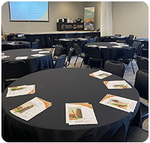 Corporate Events - Includes half or full-day rental, Wi-Fi, various seating arrangements, tables, chairs with options for a/v (projector, microphone, audio setup) and catering.